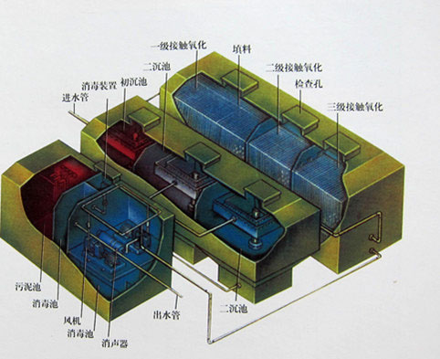 生活污水处理设备去除有机物污染物及氨氮主要依赖于设备中德AO生物处理工艺。其中工作原理是在A级,由于污水有机物浓度很高,微生物处于缺气状态,此时微生物为兼性微生物,它们将污水中的有机氮转化分解成NH3-N,同时利用有机碳作为电子供体,将NO2--N、NO3--N转化为N2,而且还利用部分有机碳源和NH3-N合成新的细胞物质。所以A级池不仅是有一定的有机物去除功能,减轻后续好氧池的有机负荷。以利于硝化作用的进行,而且依靠原水中存在的较高浓度有机物,完成反硝化作用。最终消除氮的富营养化污染。在O级,由于有机物浓度已大幅度降低,但仍有一定量的有机物及较高NH3-N存在。为了使有机物得到进一步氧化分解,同时在碳化作用处于完成情况下硝化作用能顺利进行,在O级设置有机负荷较低的好氧生物接触氧化池。在O级池中主要存在好氧微生物及自氧型细菌(硝化菌)。其中好氧微生物将有机物分解成CO2和H2O;自养型细菌(硝化菌)利用有机物分解产生的无机碳或空气中的CO2作为营养源,将污水中的NH3-N转化成NO2--N、NO3--N,O级池的出水部分回流到A级池,为A级池提供电子接受体,通过反硝化作用最终消除氮污染。
