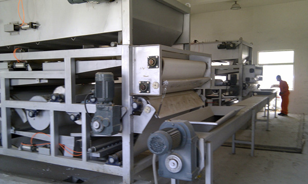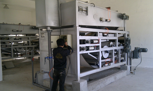 污泥重力脱水后,随着滤带的移动进入上下滤带之间的楔形加压段,得到予压缩脱水,又脱去一部分污泥便面的游离水,然后进入由八个辊组成的“S”形压榨段,由于污泥随着滤带在多个辊间的变向弯曲产生的剪切力,从而榨出内部的游离子。